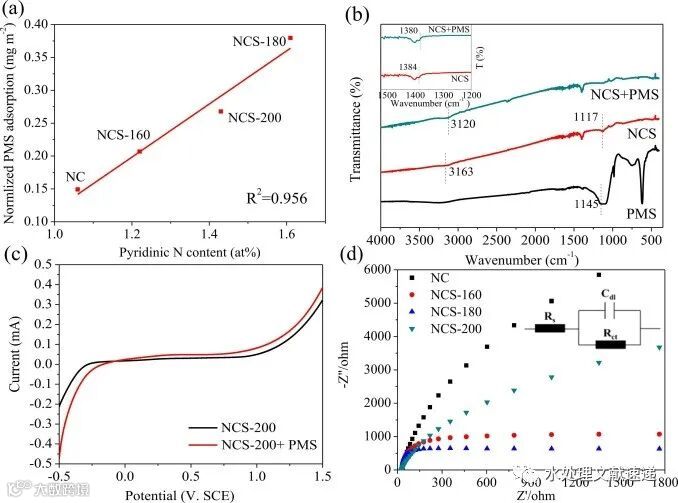 Fig. 6. (a) The correlation between the normalized PMS adsorption capacity of NCSs and the pyridinic N content; (b) the FTIR spectra of NCS-180, PMS and NCS-180/PMS; (c) the LSV curves for NCS-200 before and after PMS addition; (d) the EIS spectra of different NCSs.