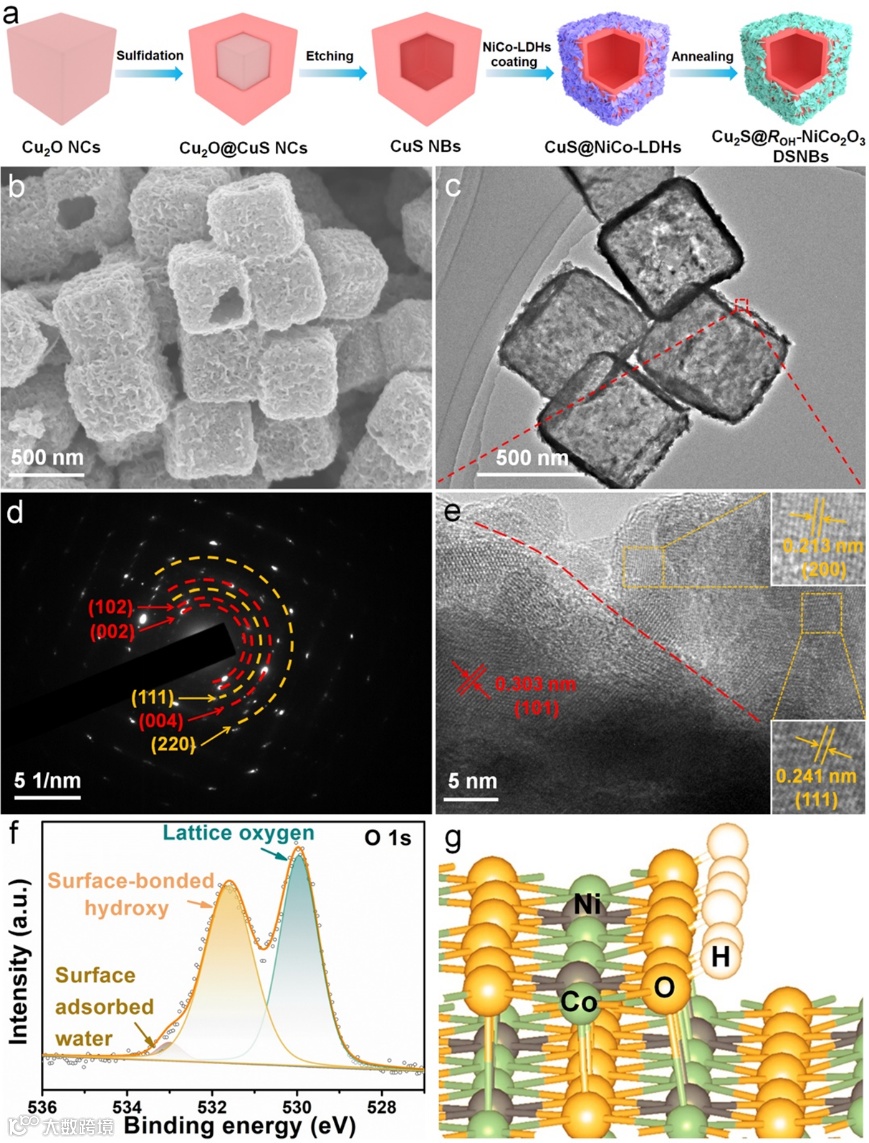 图1.(a)Cu2S@ROH-NiCo2O3 DSNBs的合成示意图。Cu2S@ROH-NiCo2O3−3 DSNBs的(b)FESEM图像,(c)TEM图像,(d)SAED,(e)HRTEM图像,(f)O 1s高分辨XPS图谱。(g)ROH-NiCo2O3表面键合羟基的模型图。