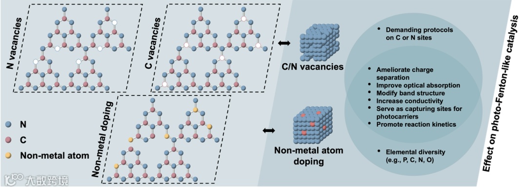 缺陷工程(结构缺陷、碳和氮空位)通过调节周期性庚嗪单元上的C/N比、提供更多反应活性位点,调节带隙结构以增强光学性能(图3)。