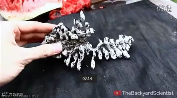 打开西瓜一看,熔化的铝在西瓜内部冷却,在缝隙中形成银色的“树枝”,一副奇妙景象。