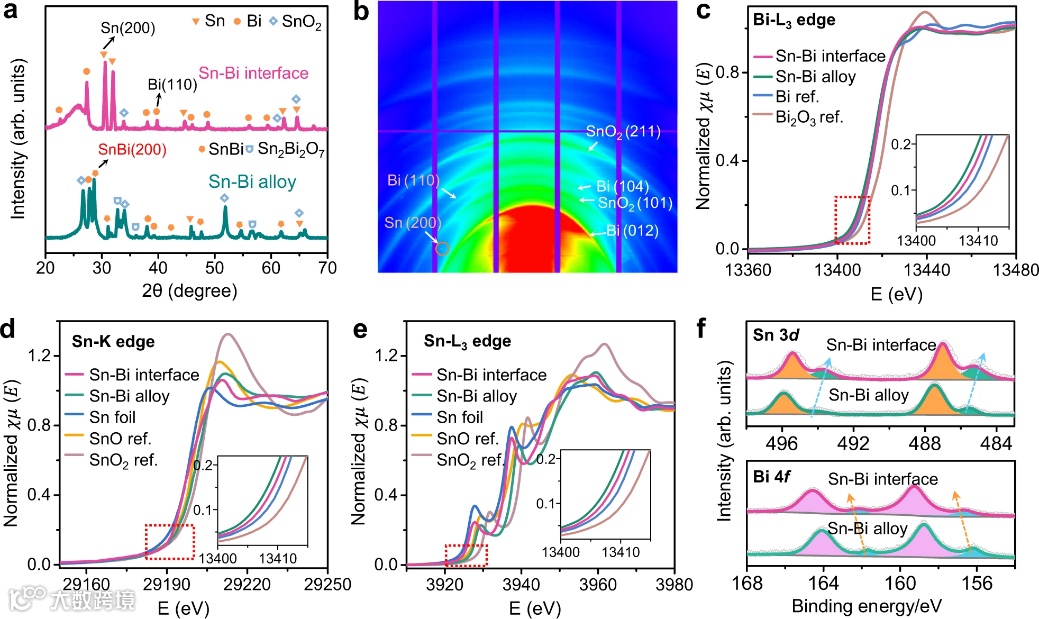 图 3. 晶体结构和电子结构分析。a XRD图。b Sn-Bi 双金属界面的同步加速器 2D-XRD 图。c-e Bi L3-edge、Sn K-edge 和 Sn L3-edge 的XANES 光谱。f Sn-Bi 界面和合金的 Sn 3d 和 Bi 4f XPS 光谱。实色线代表曲线拟合。