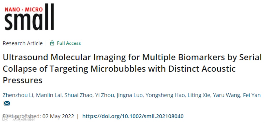 Zhenzhou Li; Manlin Lai; Shuai Zhao; Yi Zhou; Jingna Luo;Yongsheng Hao; Liting Xie; Yaru Wang, Fei Yan.Ultrasound molecular imaging formultiple biomarkers by serial collapse of targeting microbubbles with distinctacoustic pressures. Small, 2022,doi:10.1002/smll.202108040