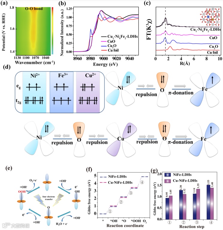 图 4. (a) OER 的原位操作 ATR FT-IR 光谱的 2D 轮廓图像(1.35-1.8 V vs RHE,使用 1.0 M KOH)。(b) Cu1–Ni6Fe2–LDHs、Cu 箔、CuO 和 Cu2O的 Cu K-edge XANES 光谱。(c) 对应的傅里叶变换 (FT) EXAFS 光谱。插图是模拟配位结构的放大图像,蓝色、银色和土黄色球分别指的是铜、镍和铁。(d) NiFe-LDHs 和 Cu-NiFe-LDHs 的 dxy 轨道中电子相互作用的示意图。(e) OER 催化机理的示意图。(f) NiFe-LDHs和Cu-NiFe-LDHs的Fe位点上,OER步骤的吉布斯自由能图。(g) OER 步骤 (RDS) 的吉布斯自由能差异。