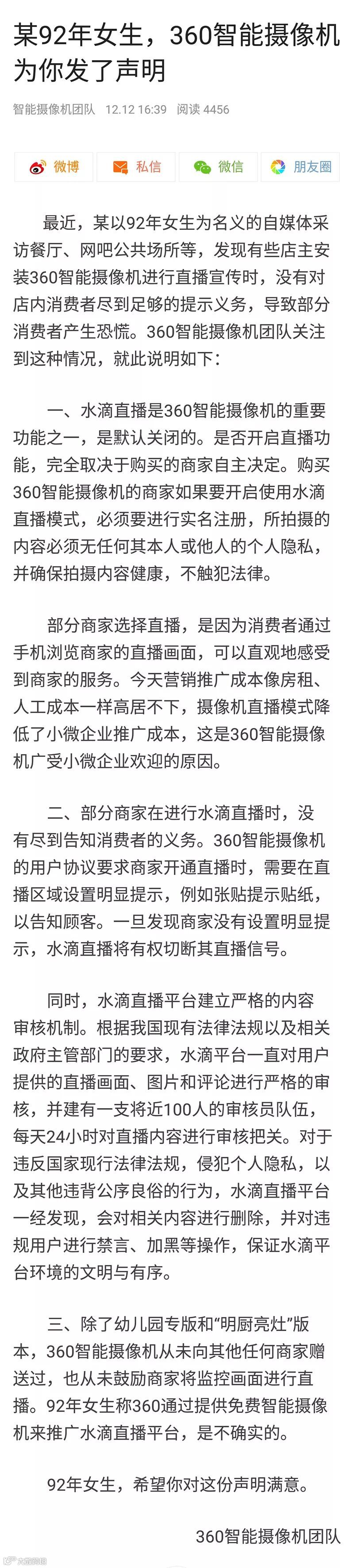此外,360智能摄像机团队亦公开发布声明,称该文章导致部分消费者产生恐慌,并存在事实性错误,例如360并未向大部分商家免费赠送智能摄像机,并称“水滴直播平台一直对用户提供的直播画面、图片和评论进行严格审核,并建有一支近百人的审核员团队,每天24小时对直播内容进行审核把关。”360还称,正着手建立凡涉及公共场所直播开通1小时内,必须上传贴纸张贴和摄像机安装照片进行验证,不合格的将予以下线处理。