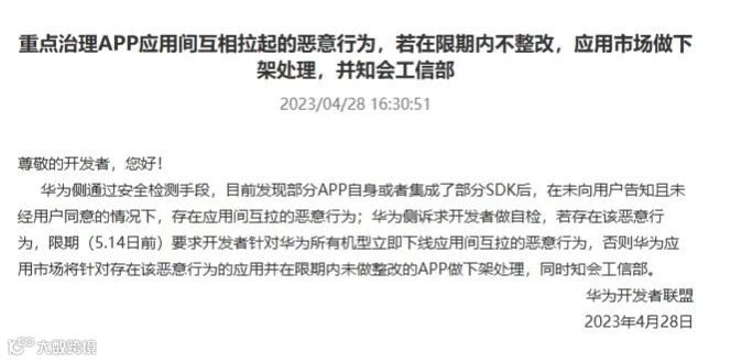 近日,华为通知开发者,将重点治理App应用间互相拉起的恶意行为,限期5月14日之前针对华为所有机型,立即下线应用间互拉的恶意行为。否则,华为应用市场将针对存在该恶意行为的应用并在限期内未做整改的App做下架处理,同时知会工信部。