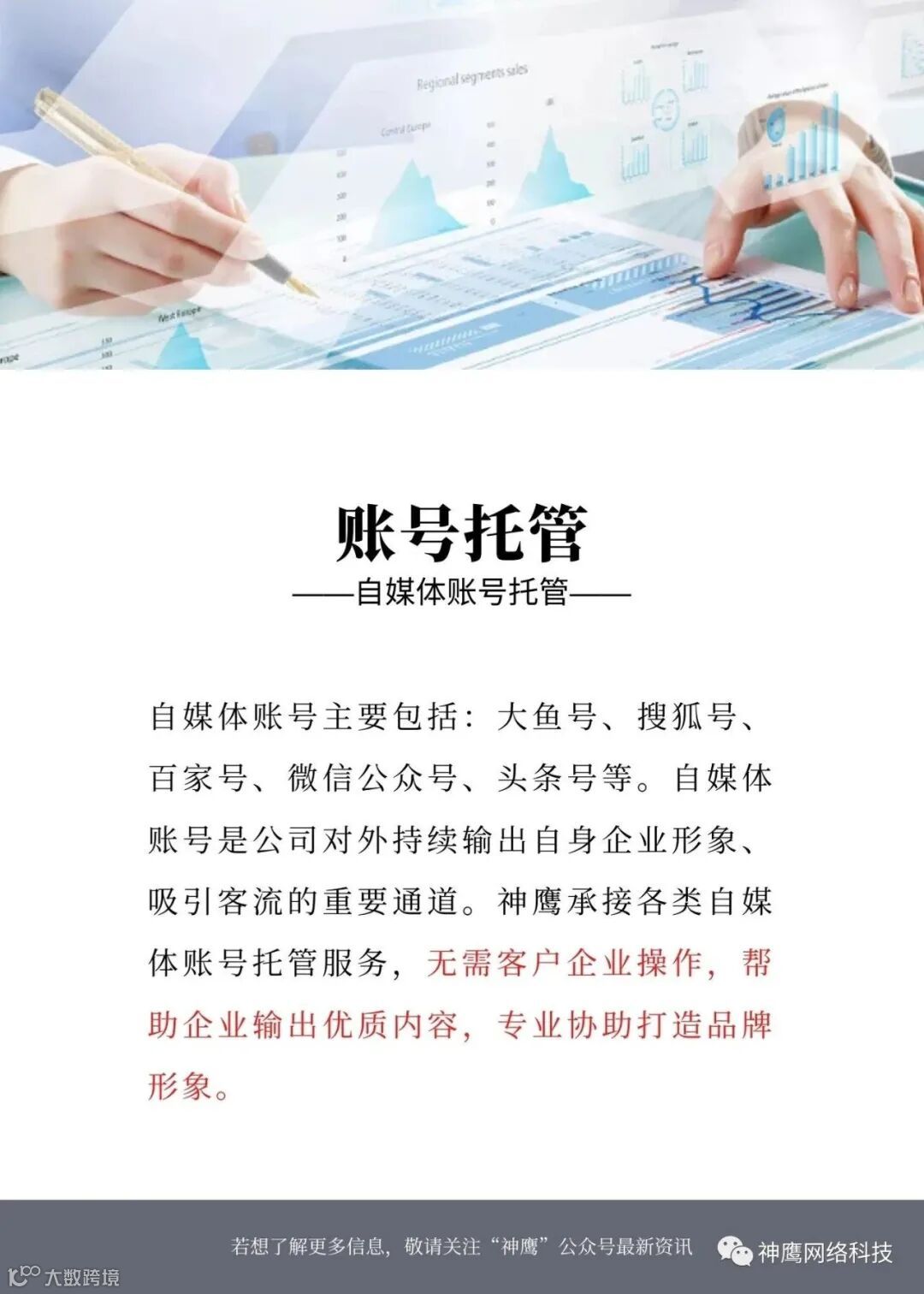 神鹰将承接各类自媒体账号托管服务,通过专业的运营管理团队、专业严谨的工作态度、丰富的自媒体账号运营经验,无需客户企业操作,帮助企业输出优质内容,专业协助打造品牌形象,为企业挖掘更多的潜在客户。