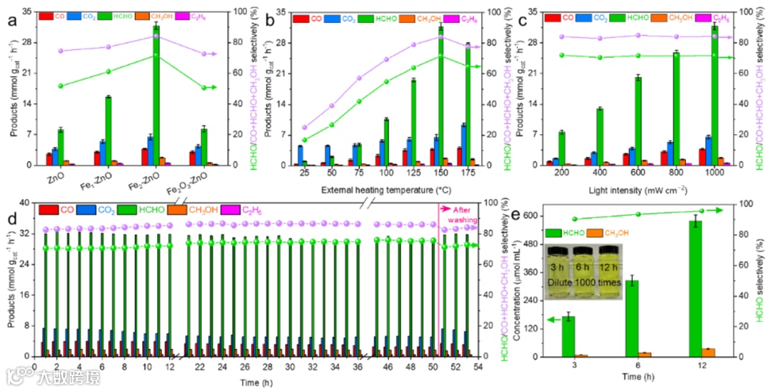 在常压下,以300 W氙灯照射和外部加热150 °C的条件下,Fe2-ZnO催化剂表现出优异的HCHO生成性能,HCHO产率达31.8 mmol gcat−1 h−1,选择性为71.7%。同时,该催化剂表现出良好的稳定性,在50小时连续反应中活性下降<10%。此外,通过12小时水吸收实验,从反应气体中获得了浓度高达579.7 µmol mL-1(1.74 wt%)的HCHO溶液,且吸收液中少量的甲醇能有效抑制HCHO聚合(图2)。