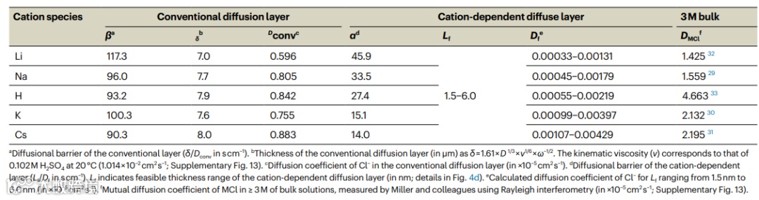 表1 基于双扩散模型的数值模拟中,50 mM MCl溶液在3600 rpm转速下的扩散参数。