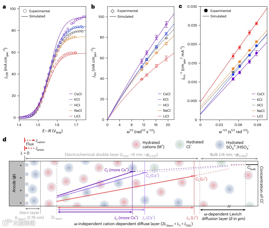 本研究采用RRDE分析研究了阳离子如何影响含有几十毫摩尔Cl−的酸性电解质中Cl−的扩散。CER的扩散极限电流密度(jlim)与阳离子种类有关,并显著影响CER选择性,表明在Li+存在的情况下, OER的选择性可以通过提高施加电位进一步提高,因为OER不受扩散限制。在Koutecký–Levich图中,无论过电位如何,观察到与阳离子相关的截距,表明存在一个与电极旋转无关的阳离子特异性扩散势垒。在所研究的阳离子中,扩散势垒(α)的强度顺序为:Li+ > Na+> H+ > K+ > Cs+。这一趋势与水合结构熵(ΔstrucS)呈线性相关。在阳离子依赖层中的Cl−扩散系数(Df)随着Li+和Na+的紧密水合网络(ΔstrucS < 0)的增加而降低,但随着K+和Cs+的疏松水合网络(ΔstrucS > 0)的增加而升高。鉴于扩散与特定的反应物-催化剂组合无关,离子依赖的反应物扩散同样适用于其他受离子杂质影响的电化学反应。然而,要将其应用于低品质水电解槽,还需要进一步的光谱验证和在不同阳离子下的推广。