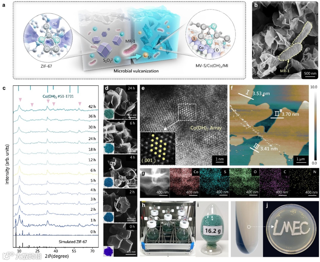图2 | 微生物硫化及形貌表征。(a) ZIF-67微生物硫化合成MV-S/Co(OH)2/MI示意图。(b) 微生物细胞与MV-S/Co(OH)2/MI的SEM图。(c) 不同时间下ZIF-67微生物硫化的PXRD监测谱。(d) 不同硫化时间下ZIF-67向MV-S/Co(OH)2/MI转变的SEM与样品照片。(e) 双球差校正HAADF-STEM图。(f) AFM图。(g) MV-S/Co(OH)2/MI元素分布图。(h) MV-S/Co(OH)2/MI实验室制备过程照片。(i) 实验室规模单次制备所得MV-S/Co(OH)2/MI样品。(j) ZIF-67硫化后细菌培养皿照片。(copyright 2025, Springer nature)