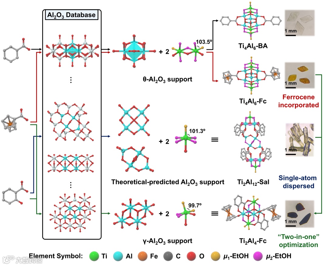 图2. 合成的Ti4Al6-BA(黑线)、Ti4Al6-Fc(红线)、Ti2Al12-Sal(蓝线)和Ti2Al4-Fc(绿线)簇合物中,配体、制备的AlOC载体与Ti活性单元之间的结构关系。