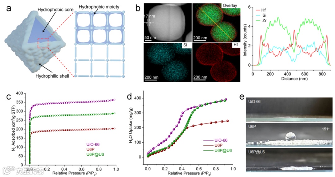 图1. (a)U6P@U6结构示意图;(b)U6P@U6(Hf)颗粒的HAADF-STEM图像和EDS元素分布图;(c)UiO-66、U6P与U6P@U6在77 K下测得的氮气吸附-脱附等温线;(d)UiO-66、U6P与U6P@U6在35°C下的水吸附等温线;(e)UiO-66、U6P与U6P@U6的水接触角照片。