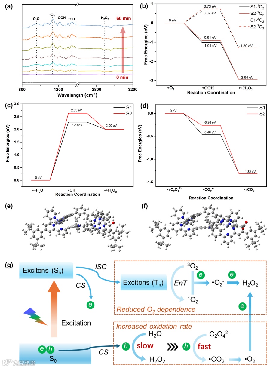 图5. (a) 配合物S1的光催化原位红外光谱。通过(b)涉及1O2和3O2的氧还原反应(ORR)及(c) H2O和 (d) Na2C2O4的光催化合成H2O2时,S1和S2的密度泛函理论(DFT)计算自由能图。(e) *OH与(f) *CO2·-在S1中的吸附构型。(g) 基于S1实现H2O2整体光催化合成的反应路径与机理推演。