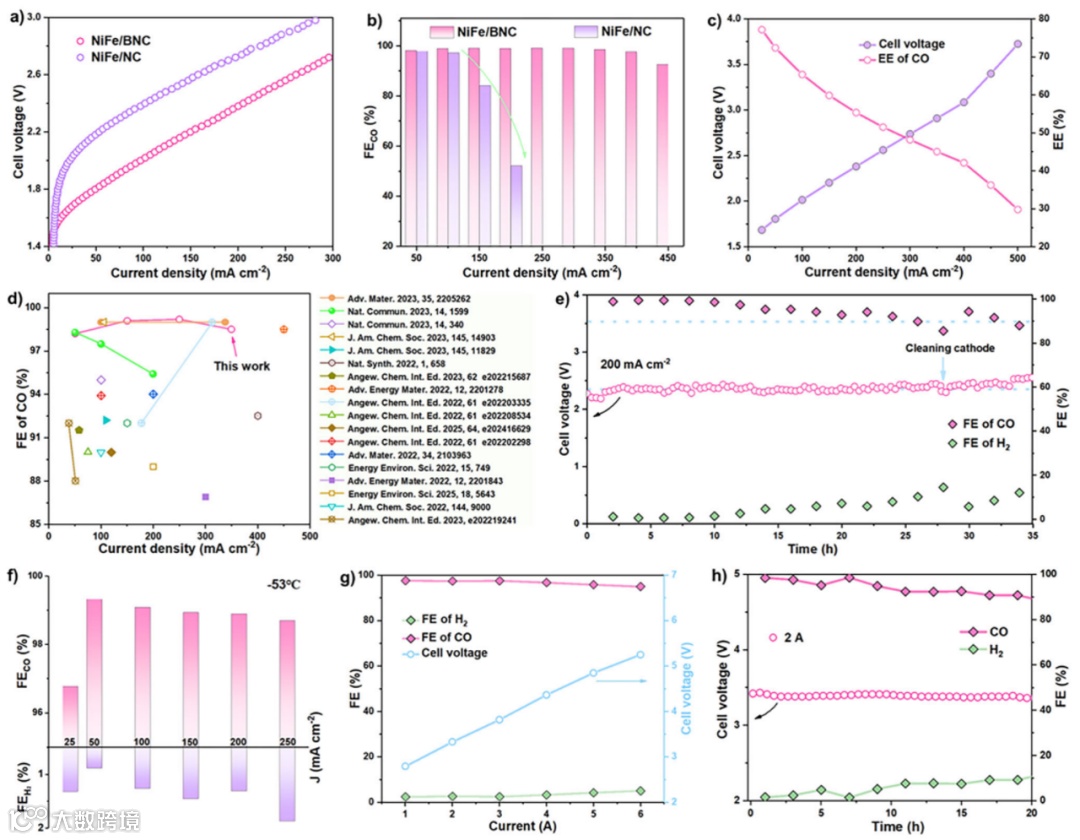 图4. NiFe/BNC催化剂在MEA电解池中的CO2电解性能及低温适应性测试