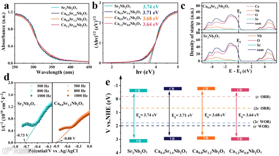 图3 (a) CaxSr2-xNb2O7(x=0, 0.4, 0.8, 1.2)的紫外-可见漫反射光谱;(b) 带隙图;(c) DFT计算得到的Sr2Nb2O7和Ca掺杂 Sr2Nb2O7的态密度(DOS);(d) Sr2Nb2O7和Ca0.8Sr1.2Nb2O7的Mott–Schottky曲线;(e) 样品的能带结构示意图及H2O2生成相关的标准氧化还原电位。