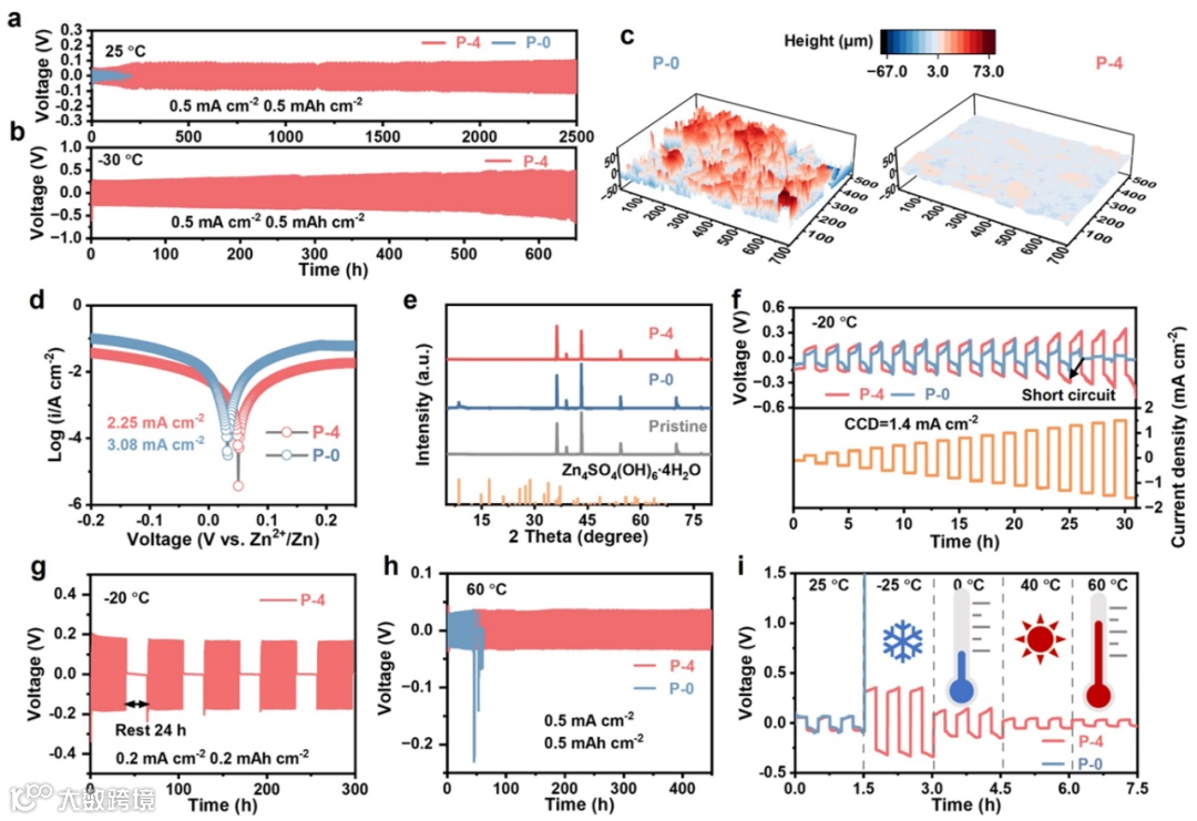图4 锌负极界面稳定性。(a) 常温和(b) −30 ℃下Zn||Zn电池长循环性能;(c) 循环后锌负极的表面高度分布;(d) 锌负极在不同电解液中的塔菲尔曲线;(e) 循环后锌负极的X射线衍射图谱(XRD);(f) 倍率性能;(g) 搁置性能;(h) 60 ℃下长循环性能;(i) 变温循环性能。