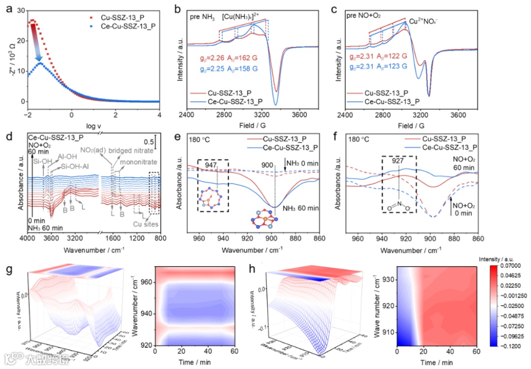 最后,研究团队通过多种原位表征手段揭示了Ce修饰提升Cu-SSZ-13催化剂抗磷性能的反应机制。电化学阻抗谱显示Ce-Cu-SSZ-13_P具有更高的Cu离子迁移率,有利于催化循环。准原位EPR与程序升温脱附实验证明,Ce修饰有效恢复了Cu-SSZ-13_P催化剂的Lewis酸位点数量(从0.58增至0.91 µmol·g-1),显著增强了其对NH3和NO的吸附与活化能力。原位红外光谱进一步揭示了反应路径的差异:在Ce-Cu-SSZ-13_P上,NH3可在Lewis酸位点稳定吸附,并能与NO+O2顺利反应生成关键中间体(亚硝酸盐等),完成Cu2+/Cu+的催化循环;而在Cu-SSZ-13_P上,磷中毒严重削弱了酸位点,导致NH3吸附量剧减,且几乎无法吸附和活化NOx分子,致使催化循环中断。这些结果共同表明,Ce的引入通过恢复并维持Cu活性位点的动态氧化还原循环,保障了SCR反应的高效进行。