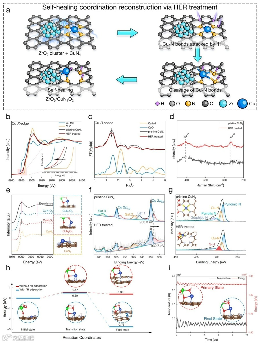 图3 重建过程的表征。(a)HER诱导结构重建的示意图。(b)Cu K边原位XANES光谱及(c) R空间傅里叶变换EXAFS光谱,分别对应原始状态和HER处理后状态的Cu箔、CuO、ZrO2/CuN4。(d)ZrO2/CuN4在原始状态和HER处理后状态的Raman光谱。(e) HER处理后ZrO2/CuN4的实验Cu K边XANES光谱与理论计算光谱对比:对应结构为CuN1O2、CuN2O1和CuN3。(f)ZrO2/CuN4在原始状态和HER处理后状态的Cu 2p和(g) N 1s XPS光谱。(h)ZrO2/CuN4在吸附氢原子前后的相对能量图。(i) AIMD模拟中ZrO2/CuN1O2随时间变化的温度与能量曲线(持续10 ps,温度300 K)。