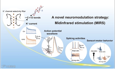 该研究发现中红外光刺激(Midinfrared Stimulation,MIRS)能够作为一种新型的神经调控(Neuromodulation)策略,调节神经元的信号发生、动作电位波形,以及动物行为,并且这种调控作用具有非热、可逆、长距离的特点。