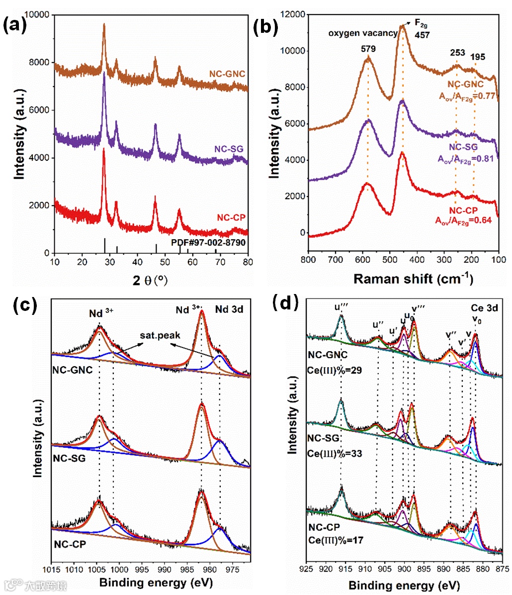 图2. (a) XRD patterns of the samples, (b) Raman spectra of the samples. XPS spectra of the samples (c) Nd 3d and (d) Ce 3d.