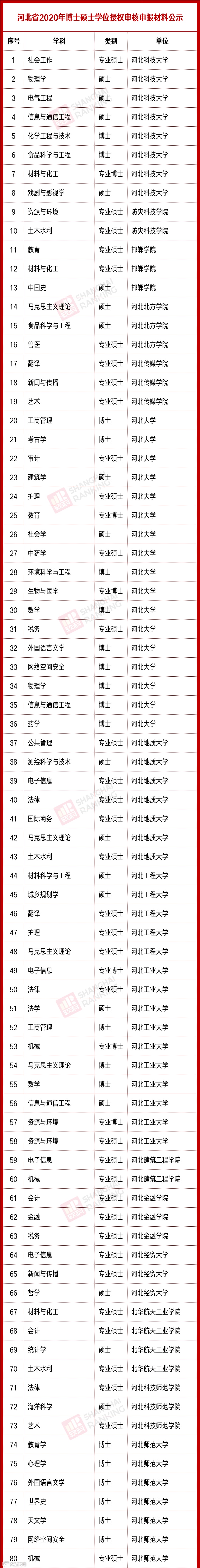 河北省2020年博士硕士学位授权审核申报材料公示名单如下: