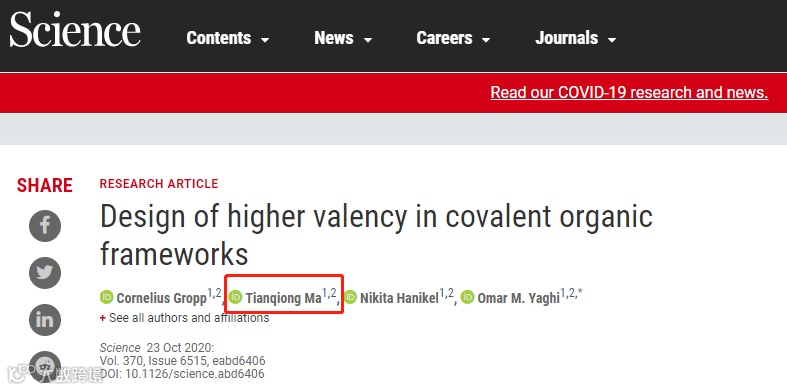2020年10月23日,毕业两年后,马天琼博士又在她所在美国加州大学伯克利分校Omar M. Yaghi课题组,和同事一起,利用她在2018年报道的新方法来合成材料、生长单晶以及解析结构,在Science上发表了题为“Design of higher valency in covalent organic frameworks”的研究,研究报告了一种价态为8(立方)和“无限”(棒状)的有机框架(COF)合成策略,实现了更高价态共价COF的设计,从而将COF化学推向了新的价态。其中,马天琼为第二作者。