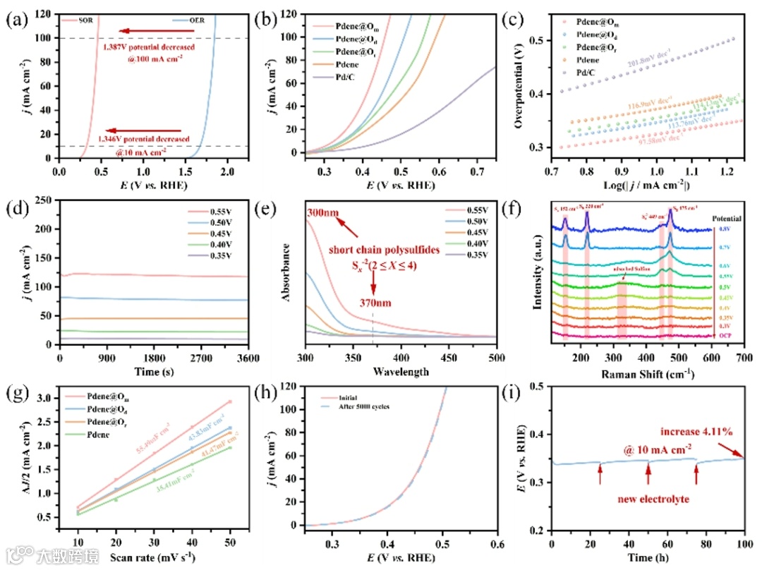 电化学测试表明,Pdene@Om在硫氧化反应中展现出了最优异的催化活性和稳定性,LSV曲线、Tafel斜率和双电层电容均表明在引入吸附氧后,反应动力学和催化剂的活性位点数量得到了明显的提升。且Pdene@Om在10 mA cm-2和 100 mA cm-2电流密度下的电位仅为325 mV和458 mV,其电位低于目前所有报道的金属烯催化剂。而对不同电压下反应1 h后的溶液进行UV-vis分析后发现,在 370 nm 处出现的特征吸收带,对应于短链聚硫离子物种(S22--S42-),且强度随着施加电位的增加而增强。此外,原位电化学拉曼光谱表明,S2-吸附在Pdene@Om表面后依次氧化形成 S22-、S32-和S42- 中间体;随后这些中间体聚合氧化生成单质硫(S8)。