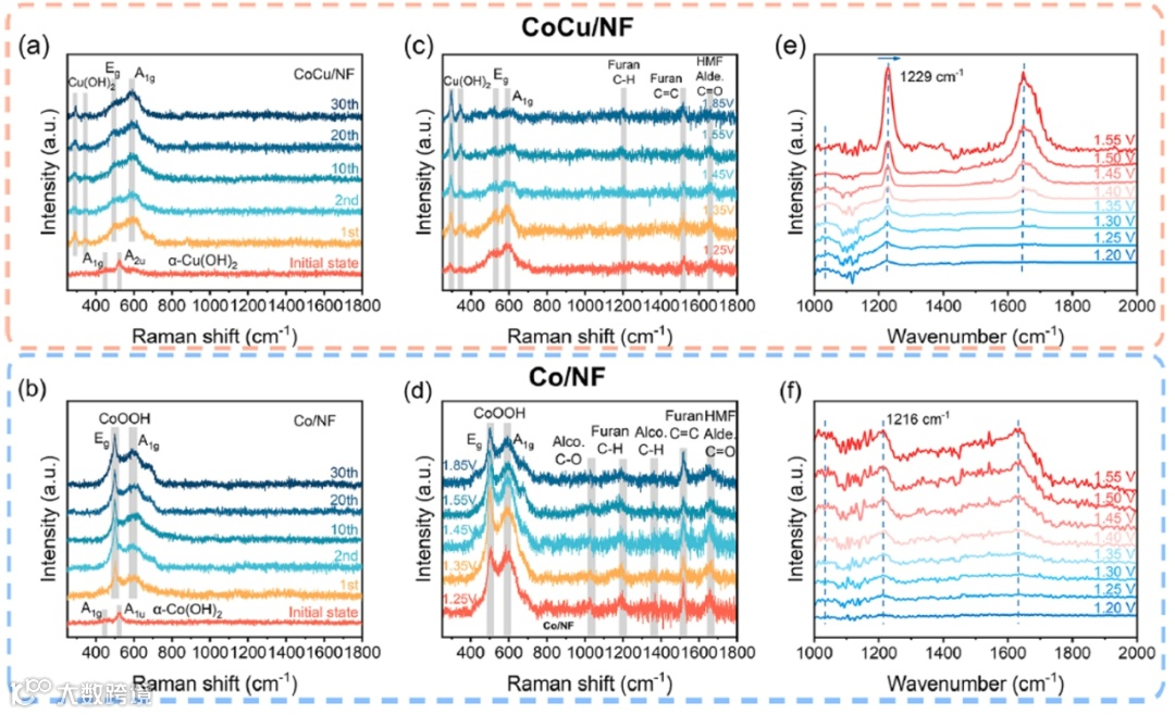 2. 原位拉曼(c、d)表明,CoCu/NF表面HMF呋喃环C=C/C=O峰迅速衰减,且未出现HMFCA 的醇/醛特征峰;Co/NF则出现明显醇/醛峰,表明垂直吸附及中间体积累。