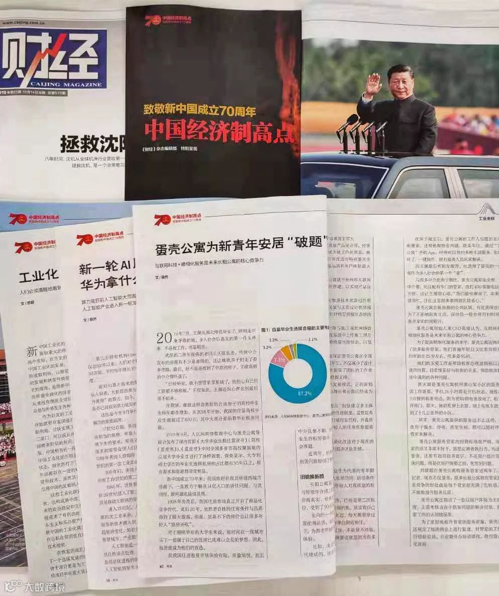 在 10 月 14 日出版的 2019 年第 23 期《财经》杂志中,《蛋壳公寓为新青年安居破题》文章登上这份承载 70 年改革变迁的厚重文本。蛋壳公寓是中国知名的互联网长租公寓运营商,致力于用互联网方式改造传统的住房租赁行业。