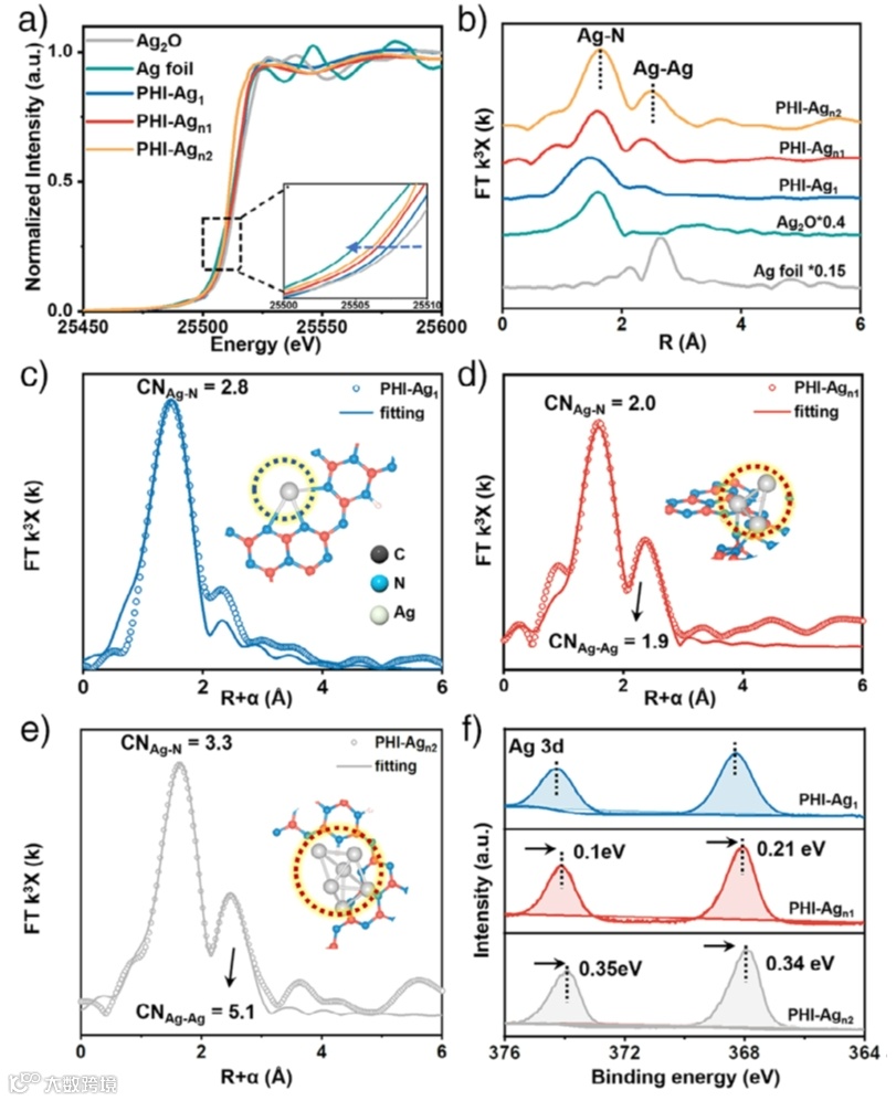 图2. a) 归一化Ag K-edge XANES光谱,b) PHI-Ag1、PHI-Agn1、PHI-Agn2、Ag箔和Ag2O在Ag K-edge的k3加权傅里叶变换EXAFS光谱。c) PHI-Ag1、d) PHI-Agn1和e) PHI-Agn2的傅里叶变换EXAFS R空间拟合曲线。插图为PHI-Ag1、PHI-Agn1和PHI-Agn2的局部结构示意图。f) 所有催化剂的Ag 3d高分辨率XPS光谱。