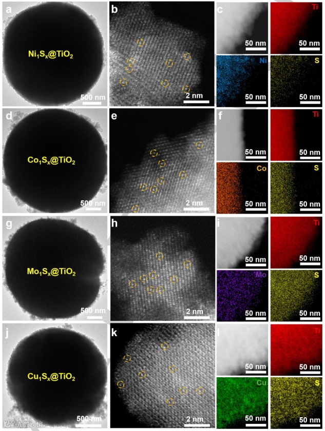图7. (a-c) Ni1Sx@TiO2, (d-f) Co1Sx@TiO2, (g-i) Mo1Sx@TiO2和(j-l) Cu1Sx@TiO2的TEM图、像差校正HAADF-STEM图、STEM图及EDX元素映射图。
