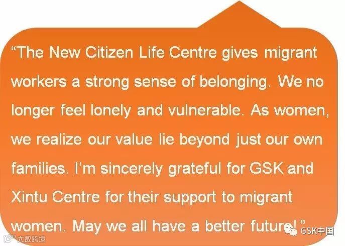 Since 2009, GSK China has partnered with a non-profit organisation Xintu Centre to improve the overall wellbeing of migrant families through the creation of New Citizen Life Centres in big cities. These centres organise health education activities on a regular basis, mainly focusing on women and children’s health in the migrant community.