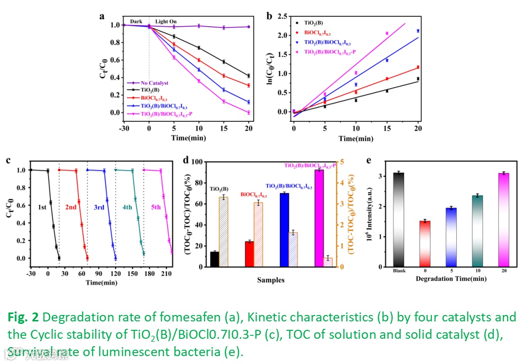 Xueying Cheng, Renquan Guan, Yunning Chen et. al. The unique TiO2(B)/BiOCl0.7I0.3-P Z-scheme heterojunction effectively degrades and mineralizes the herbicide fomesafen. Chemical Engineering Journal 2022, 431, 134021.