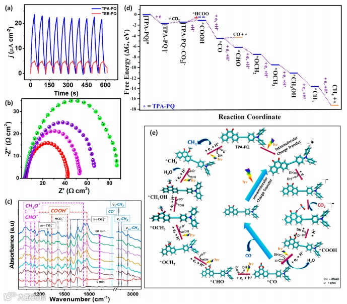 为此,开发一种无金属有机半导体将是一种应对成本、稳定性和可持续性问题的替代选择。然而,由于多电子转移的高动力学势垒和CO2RR的高还原电位,制备无金属有机光催化剂是一项具有挑战性的任务。该工作合理地设计了一种具有氧化还原活性共轭微孔聚合物TPA-PQ,并实现了其在可见光下高效地驱动二氧化碳还原为甲烷。