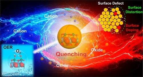 开发一种用于调控电催化剂表面的纹理、组成和电子结构的可行策略对于电催化性能至关重要,尽管仍然具有挑战性。在这里,作者开发了一种简单而通用的策略—淬火,通过在盐溶液中快速冷却金属氧化物纳米催化剂来精确控制金属氧化物纳米催化剂的表面化学。以 NiMoO4 纳米催化剂为例,作者成功合成了淬火纳米催化剂,在 10 mA cm-2和 100 mA cm-2 下,氧析出反应 (OER) 过电位分别降低了 85 mV 和 135 mV。通过详细的表征研究,作者确定淬火诱导了大量无序阶梯表面和近表面金属离子掺杂的形成,调节了 Ni、Mo 的局域电子结构和配位环境,从而促进了双位点活性物质的形成,为 OER 提供更低的能垒途径。这种淬火策略也成功地应用于许多其他金属氧化物,如尖晶石型 Co3O4、Fe2O3、LaMnO3和 CoSnO3,它们同样具有类似的表面改性和 OER 活性提升。作者的发现为活化金属氧化物催化剂提供了新的灵感,并扩展了淬火化学在催化中的应用。