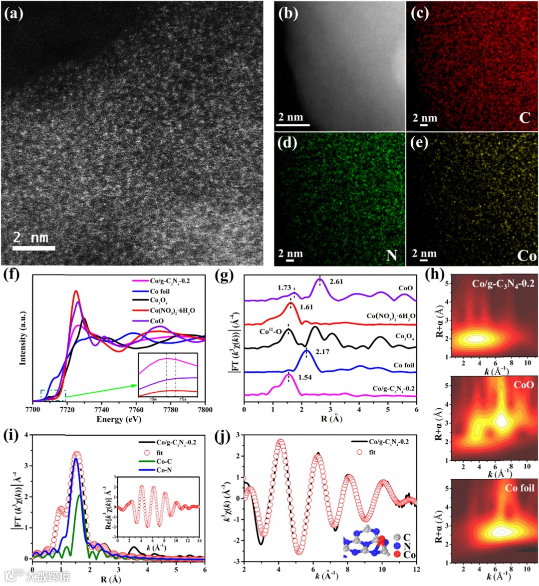 图2. (a) Co/g-C3N4-0.2的AC-HAADF-STEM图;(b-e) Co/g-C3N4-0.2的HAADF及STEM-EDX元素映射图;Co箔, CoO, Co3O4, Co(NO)3·6H2O, Co/g-C3N4-0.2的(f) Co K-edge XANES光谱和(g)傅里叶变换k3-weighted EXAFS光谱;(h) Co/g-C3N4-0.2、CoO和Co箔的小波变换结果;Co/g-C3N4-0.2在(i) R空间和(j) k空间的EXAFS拟合曲线。