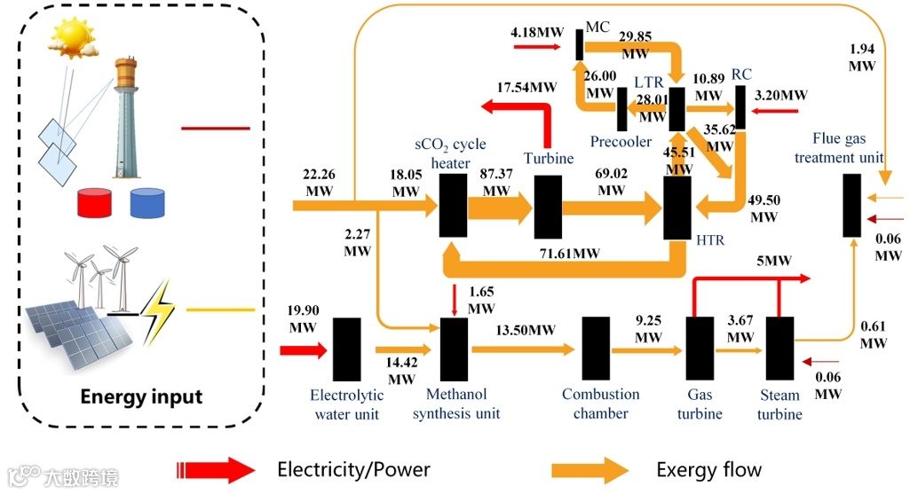 研究团队设计的集成系统包括太阳能熔盐储热单元、sCO2循环发电单元、甲醇合成单元、GTCC单元、烟气处理单元以及电解水设备。