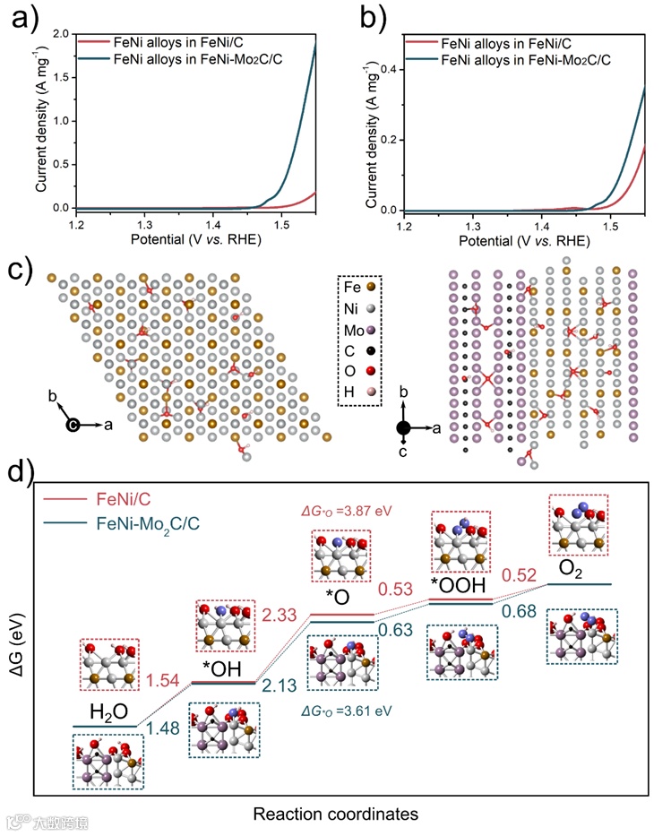 基于以上对产氧活性位点的分析,根据总活性、活性位点数量、本征活性的关系进行估算,发现FeNi-Mo2C/C中铁镍合金的电催化产氧本征活性高于FeNi/C(图5a,b)。利用分子动力学模拟得到表面氧化的铁镍合金、铁镍合金/碳化钼结构(图5c),并进一步采用密度泛函理论计算产氧各步骤的反应自由能(图5d)。可知碳化钼异质相引入前后,第二步反应(由*OH生成*O)均为整个产氧反应的速率限制步骤;特别地,碳化钼的引入降低了该速率限制步骤的反应自由能,即由引入前的2.33 eV下降至引入后的2.13 eV,故而有利于产氧反应本征活性的提升。