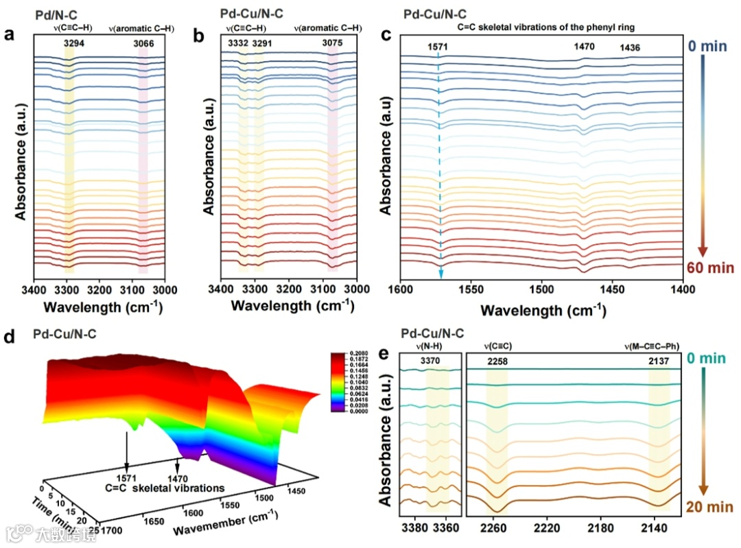 原位漫反射傅里叶变换红外光谱(DRIFTS)研究揭示了Pd-Cu双原子催化剂协同活化机制,并对比Pd、Cu单原子催化剂的差异。Pd/N-C原子催化剂暴露于苯乙炔/碘苯分子后(图4a),出现苯乙炔的C≡C-H(末端炔基C-H键)伸缩振动谱峰。Cu/N-C单原子催化剂谱图中末端炔基C-H振动较弱,但C≡C伸缩振动红移,且末端炔氢在1H NMR谱中呈现化学位移,证实Cu/N-C单原子位点通过π活化机制活化末端炔烃。与Pd/N-C单原子催化剂相比,非对称Pd-Cu双位点催化剂对底物分子基团活化作用显著增强(图4b)。时间分辨的原位红外光谱(Time-resolved Operando FT-IR)进一步阐明反应路径(图4e),并验证了双位点协同机制的优势。