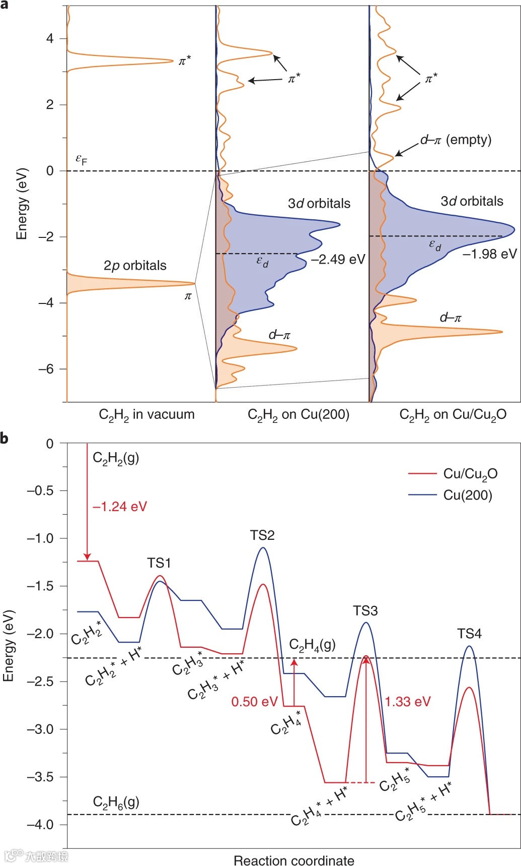 图 4. 乙炔还原的动力学分析。a,真空中C2H2 的C 2p 轨道以及吸附在Cu(200) 和Cu/Cu2O 上的C2H2 的Cu 3d 轨道和C 2p 轨道的投影电子密度。 b, 乙炔在 Cu/Cu2O 和 Cu(200) 上加氢的能量分布。星号表示活性物质的吸附状态。