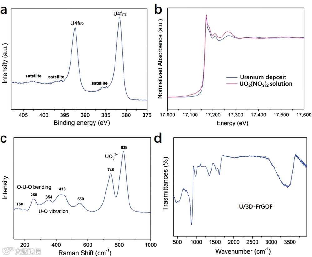 图 4. a) 铀沉积后 3D-FrGOF 中 U 4f 的高分辨率 XPS 光谱。 b) 铀沉积物和标准 UO2(NO3)2 的 XANES 光谱。 铀沉积后 3D-FrGOF 电极的c) 拉曼和 d) FTIR 光谱。