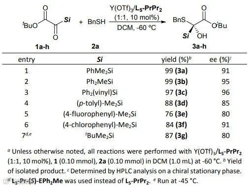 首先,作者选用硅基乙醛酸叔丁酯1a与苄硫醇2a为标准底物,对该不对称反应进行条件优化(图2)。考虑到较强的背景反应,首先选择在低温下尝试反应(-45 ºC)。通过对手性双氮氧配体的考察,作者发现随着碳链的增长,对映选择性随之增加;使用碳链数为5个碳的L5-PrPr2与三氟甲磺酸铒配位形成配合物催化剂,以89% ee的对映选择性得到目标α-硅基-α-巯基叔醇产物3a。值得一提的是,当使用酰胺部分为脂肪类的配体L3-PrtBu时,立体选择性较差(编号3)。进一步对温度、溶剂、金属盐进行筛选,确定了最优反应条件,以L5-PrPr2/Y(OTf)3手性双氮氧金属配合物为催化剂,二氯甲烷为溶剂,在-60 ℃下,以接近当量的收率和91% ee的对映选择性得到产物3a。值得一提的是,催化剂用量降低至2 mol%,仍能以96%的收率和90% ee得到产物。