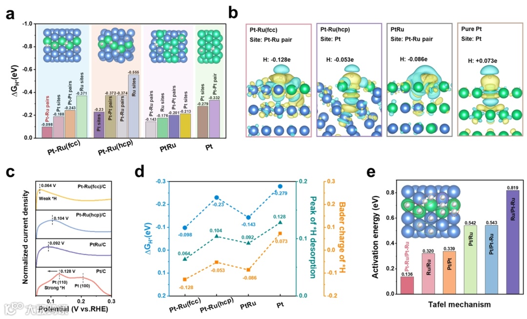 1. 桥式吸附氢(Hbridge)主导高效析氢:通过原位增强红外光谱(ATR-SEIRAS)和理论计算,在Pt-Ru界面处发现了一种高效的氢吸附构型—桥式吸附氢(Hbridge)。Pt-Ru原子d轨道相互作用显著降低了Hbridge的吸附自由能(ΔGH*= -0.098 eV),加速了氢脱附过程,Tafel动力学能垒降至0.136 eV。