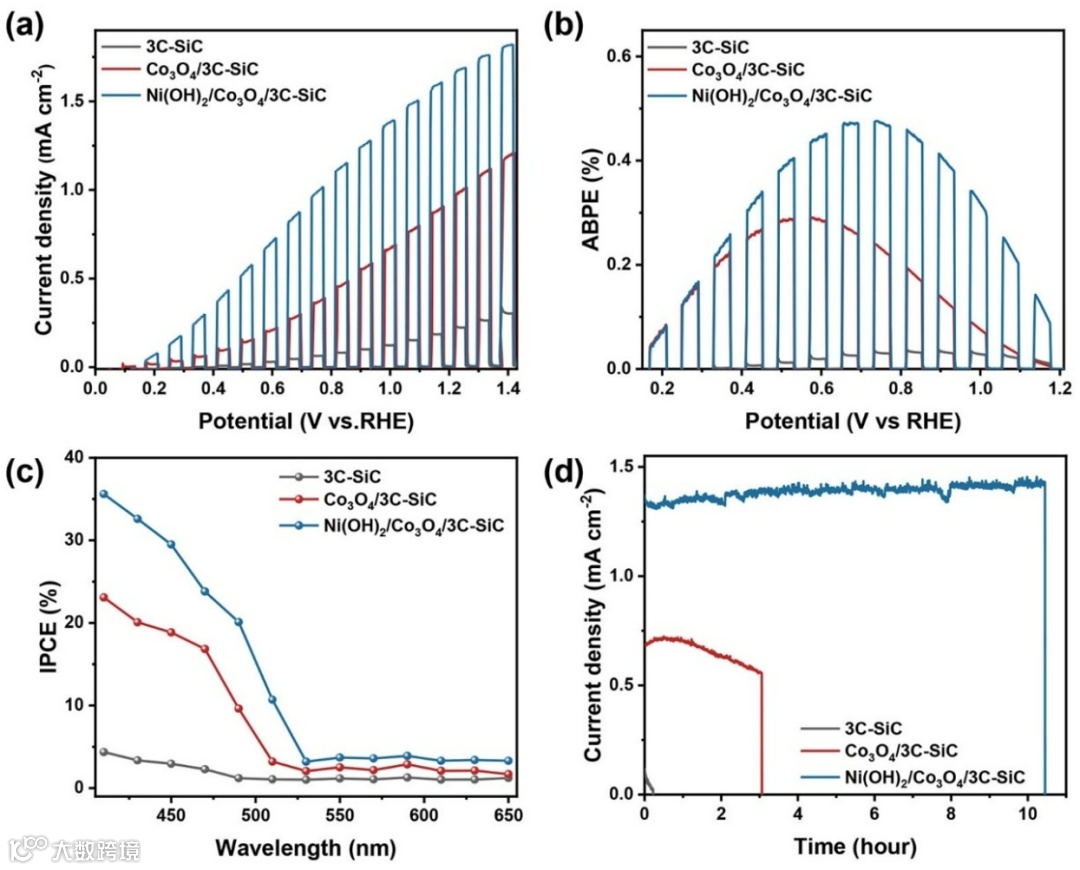 PEC测试表明,Ni(OH)2/Co3O4/3C-SiC光阳极的光电流密度在1.23 VRHE时达到1.68 mA/cm2,比原始3C-SiC提高了8倍。ABPE和IPCE测试进一步表明,Ni(OH)2/Co3O4/3C-SiC光阳极的太阳能转化效率和光电流转换效率显著高于3C-SiC和Co3O4/3C-SiC,表现出卓越的光电催化性能和稳定性。