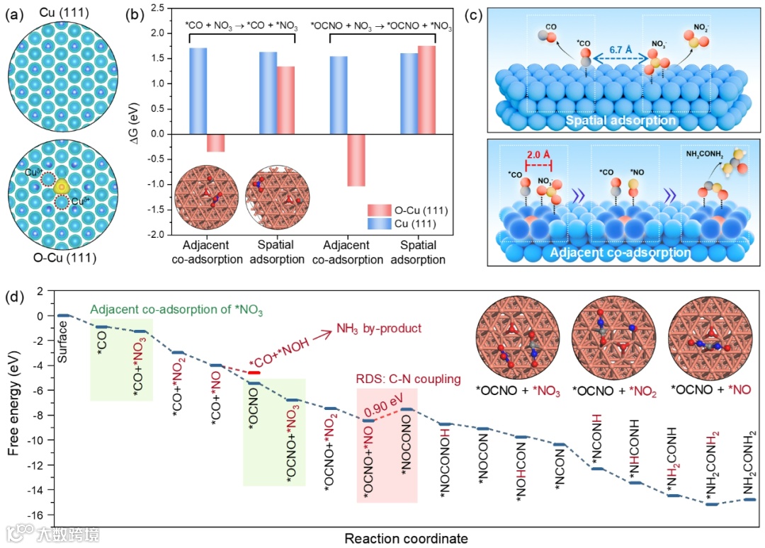 图5 理论计算。(a) Cu (111)和O-Cu (111)的电荷密度图;(b) Cu (111)和O-Cu (111)模型上相邻共吸附和孤立吸附行为的Gibbs自由能变比较,左右插图分别为O-Cu (111)上优化的相邻共吸附和孤立吸附模型结构;(c) Cu催化剂上的孤立吸附以及OL-Cu催化剂上的相邻共吸附示意图。(d) O-Cu (111)上尿素合成的自由能图。