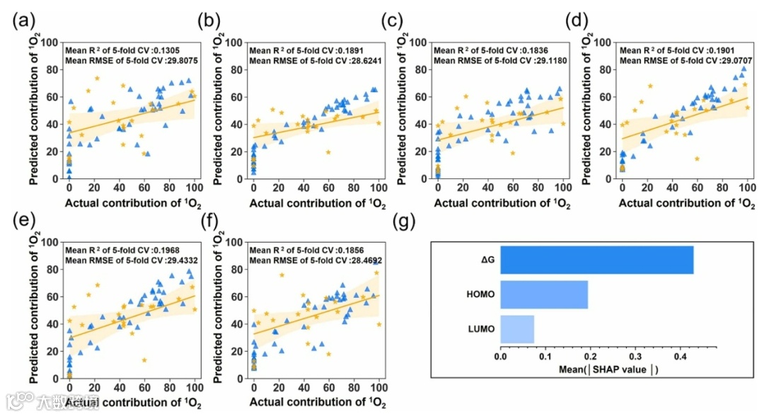 图 6. 基于数据集 II. 的 (a) LGB、(b) Catboost、(c)XGB、(d) GBR、(e) RF 和 (f) ET 的预测性能1O2 Contribution 时,蓝色 scatter 表示用于训练的数据,橙色 scatter 表示测试数据。总共获得了 71 个数据点用于模型开发。橙色阴影表示测试点上回归线的 95% 置信区间。(g) 基于 GBR 模型的污染物特征测序1O2基于 SHAP 值的反应性。