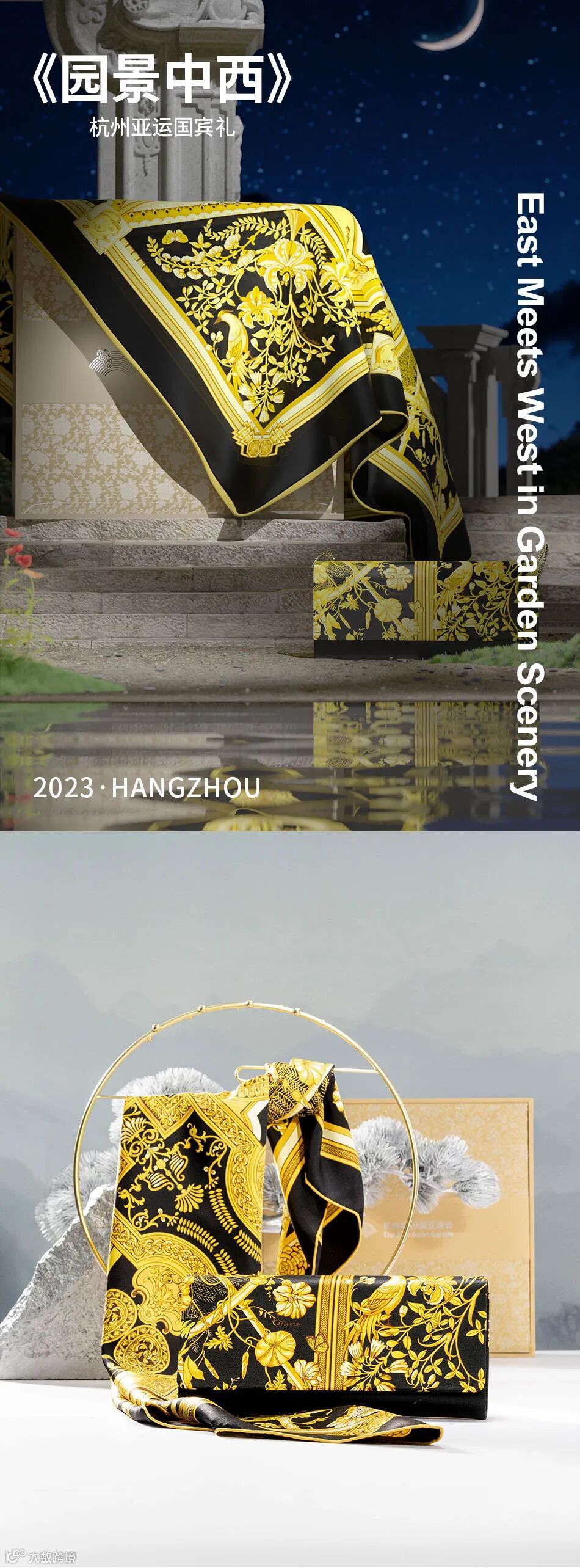 真丝方巾「锦绣钱塘」,设计师运用更具江南韵味的素写和淡彩手法勾勒画面,将几大颇具设计感的亚运会主场馆与京杭大运河、雷峰塔、西湖等文化古迹相融,展现出杭州独特的人文之美。相较之下,钱江新城、互联网科技产业的兴起,又展现了互联网时代高速发展中的新杭州之美。