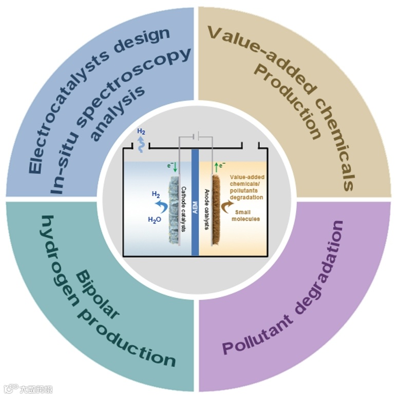 通过电化学或光电化学水分解获得清洁氢被认为是未来能源的创新技术。这一可持续战略使全球实现了零碳排放,避免了不可再生化石燃料(煤、石油和天然气)带来的严重环境污染。然而,电化学水分解制氢中缓慢的氧气析出反应(OER)速率是影响电催化水分解制氢(HER)效率的重要因素。目前,研究者对于阴阳极电催化剂的设计得到了快速发展,然而由于OER高平衡电位的限制,使电解水槽电压很难得到有效降低。选择氧化电位较低且具有高附加值的氧化反应代替OER可解决制氢槽电压和电耗过高的问题。同时,也规避了传统电解水中氧气析出带来的一些弊端。比如,避免了H2/O2混爆带来的安全问题,OER过程中产生活性氧物种减少离子交换膜寿命。最终产生相比于氧气具有更高价值的化学品或实现高价值废水电氧化降解过程。