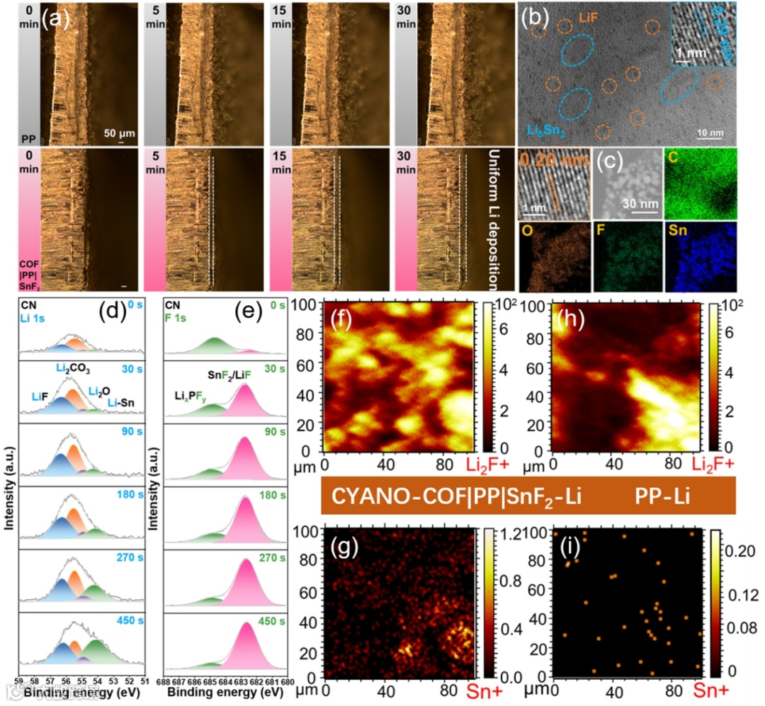 Li对称电池的横截面图像在不同时间暴露于相同的5 mA cm-2电流密度下。在使用PP的Li||Li电池中,锂枝晶在锂沉积5分钟后开始形成。随着沉积时间的增加(15分钟后),枝晶越来越多,这可能导致短路危险,并给锂金属电池带来严重的安全风险。相反,CYANO-COF|PP|SnF2隔膜可以促进锂的均匀沉积。锂沉积层的厚度随着时间的推移逐渐增加,并且锂负极表面保持光滑。为了深入了解通过使用改性隔膜构建的SEI,我们进行了x射线光电子能谱(XPS)和飞行时间二次离子质谱(ToF-SIMS)测试,以详细分析阳极界面的纳米结构和化学成分。通过连续Ar离子溅射的XPS深度分析检测循环后的锂阳极,以研究界面性能。Li 1s的高分辨率XPS光电子能谱显示了LiF(56.2 eV)、Li2CO3(55.4 eV)、Li2O(54.9 eV)和Li-Sn合金(54.2 eV)的化学成分。这些物质的强度随着溅射深度的增加而逐渐增加,表明内部SEI含有更多的无机物质。SEI中富集的SnF2/LiF的分布可归因于SnF2与Li反应生成LiF。为了进一步了解CYANO-COF|PP|SnF2隔膜对SEI组成的影响,利用ToF-SIMS研究了循环阳极上生成的SEI。观察到Li2F-和Sn+,这是LiF和Li-Sn合金的典型离子碎片。这些界面分析结果表明在SnF2/Li界面上原位形成的界面保护层可以通过促进界面Li+迁移来实现无枝晶的Li沉积。