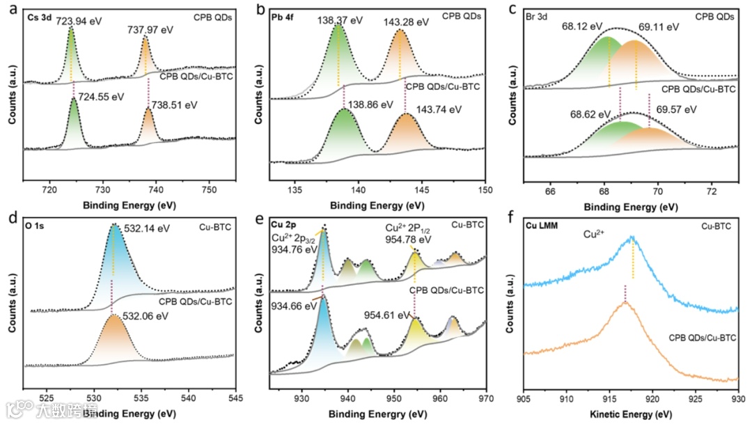 进一步分析 CPB QDs 和 Cu-BTC 之间的化学成分、价态和界面相互作用。如图5a,涂覆 Cu-BTC 后,Cs 3d、Pb 4f 和 Br 3d 峰发生正向偏移(图 5b-c)。相反,O 1s 和 Cu 2p 光谱呈现出相反的趋势。此外,通过卫星峰和俄歇光谱证明了 Cu2+ 的存在。(图5d-f)。